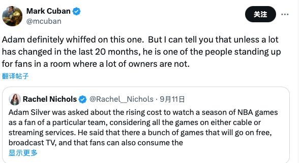 对此独行侠前老板库班今日转发了萧华的言论,并回复道:“他这次确实错了,但我可以告诉你,除非过去20个月的时间里发生了巨大变化,否则在很多老板不顾球迷利益的场合,萧华都是为粉丝挺身而出的人之一。”