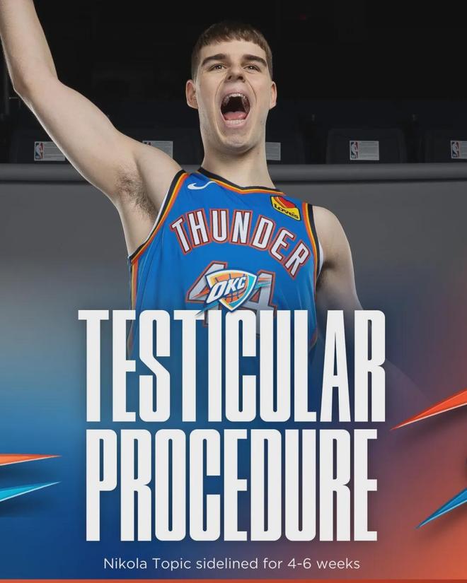 雷霆官宣,托皮奇接受的是睾丸手术,目前手术成功,需要在4到6周之后接受重新评估。与此同时,雷霆并没有公布托皮奇的睾丸受伤的原因。
