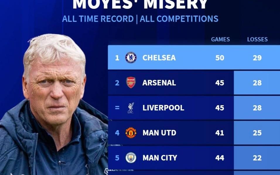 50战29负,切尔西成为莫耶斯教练生涯输球次数最多的对手