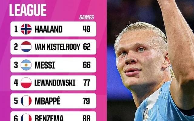 欧冠50球最快达成:哈兰德49场居首,梅西66场第2,C罗91场第7