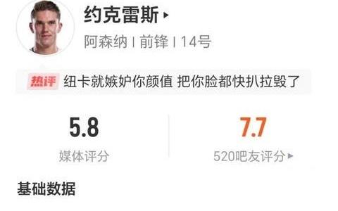 约克雷斯数据:6射1正两次射偏,9次争顶仅成功1次,获评5.8分