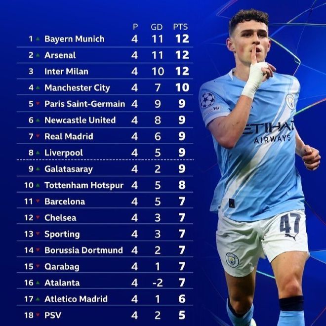 目前欧冠战罢4轮,英超6队有5队跻身欧冠积分榜前10位。其中阿森纳4连胜高居第2,曼城则排名第4,纽卡第6利物浦第8,4队暂时都处于直通淘汰赛的区间。